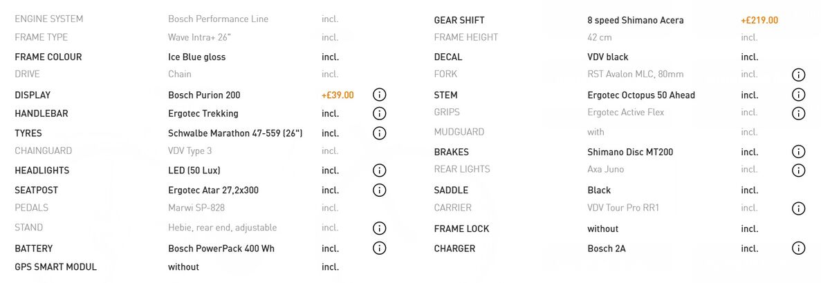 | Upgrades | Display - Bosch Purion 200 +£39.00 Gear shift - 8 speed Shimano Acera +£219.00 |