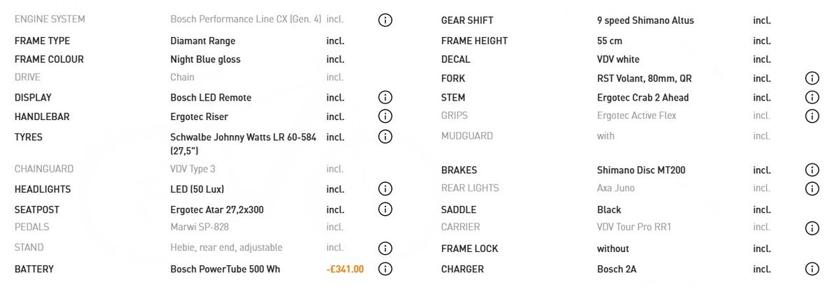 Upgrades | Some examples of upgrades : Battery Bosch Powertube 750 +£341 Battery Bosch Powertube 750 +£171 Frame Lock +£29 Seatpost G.2 ST Parallelogram +£139 Brakes Shimano MT420 +£89 Tyres Schwalbe Marathon Plus Tour +£19 Display Bosch Purion 200 +£39 Fork RST Vogue E AIR, 80mm, QR +£99 Gear Shift 5spd Nexus freewheel +£339 Gear Shift 8spd Nexus freewheel +£229 Gear Shift 8spd Acera +£219 Gear Shift Enviolo TR +£649 |