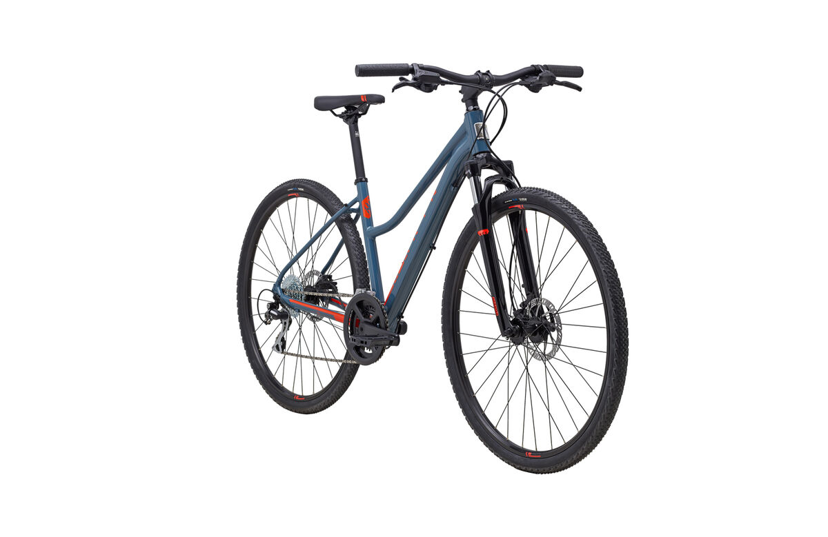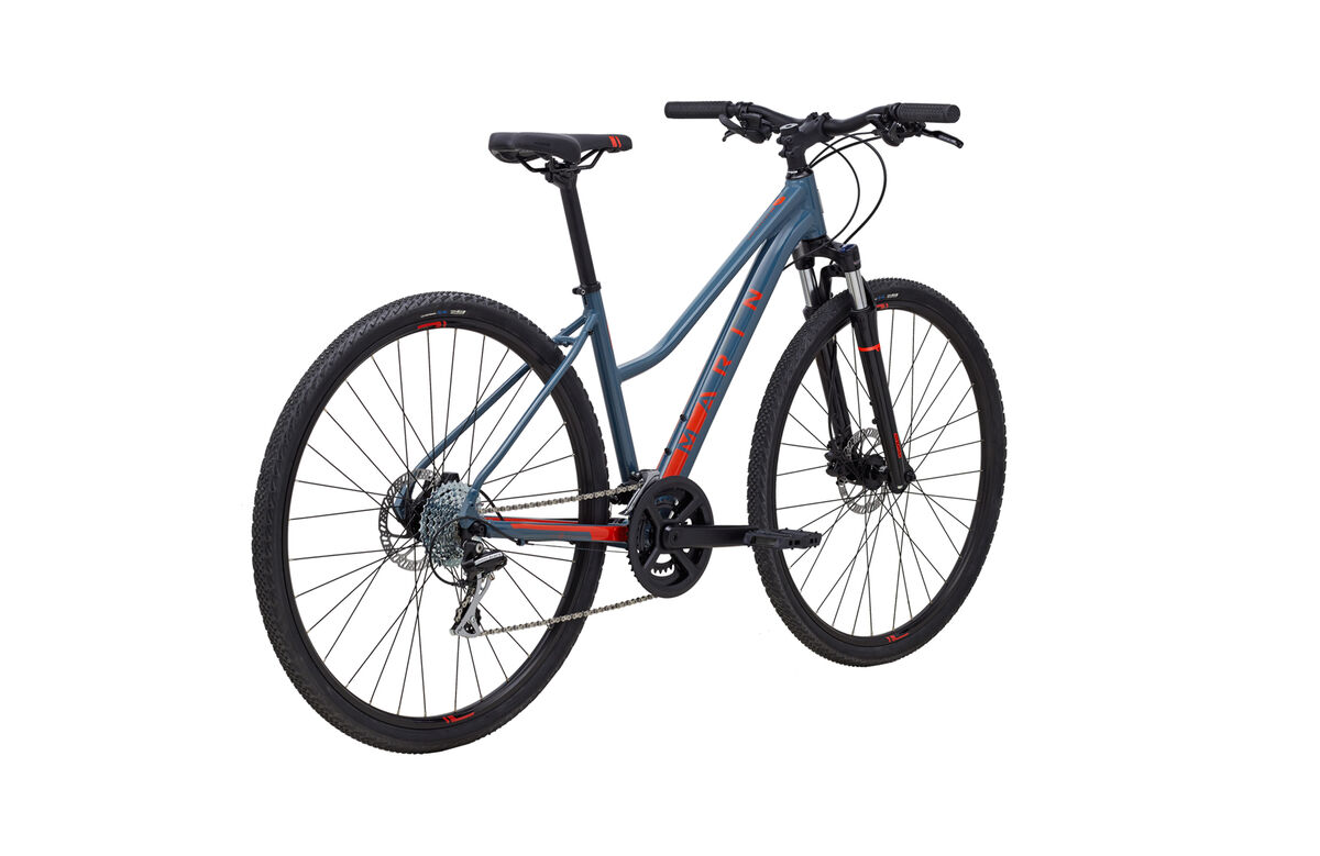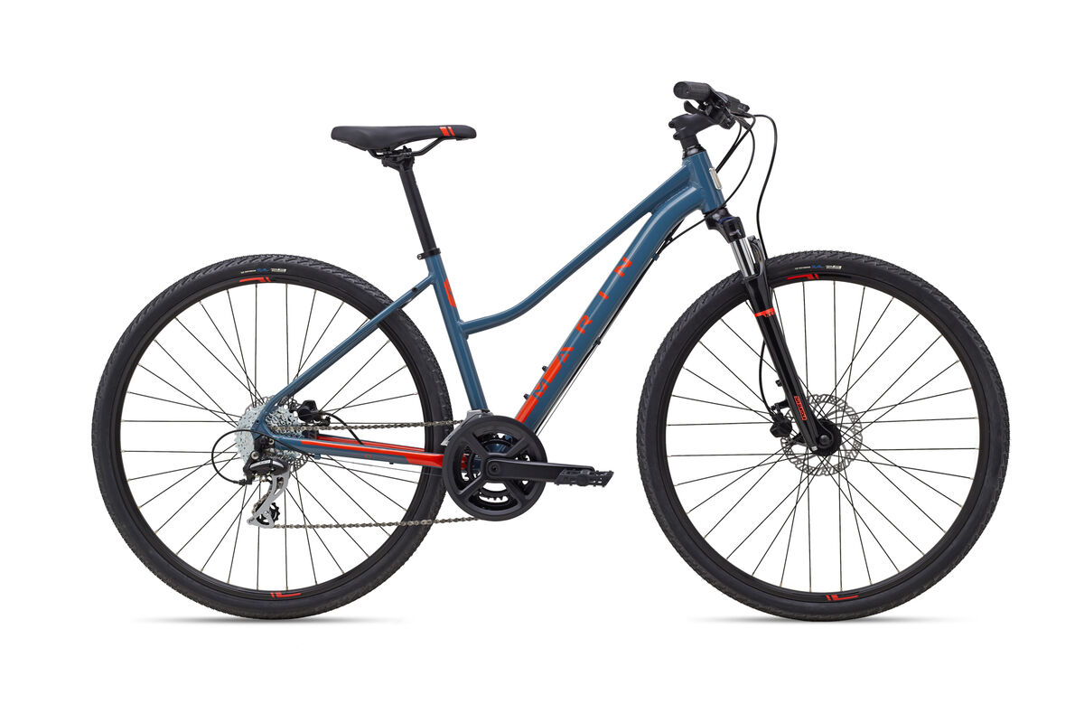 Product | The San Rafael and San Anselmo are for riders looking to explore mixed surfaces and terrain, travel the local rail-trail system, and explore paved paths and dirt doubletrack equally at home. Dual Sport bikes are a bridge between pavement and dirt, for the adventurous fitness and recreational rider. San Rafael and San Anselmo bikes are designed and built for active recreational riders looking to explore on and off paved surfaces. These models offer lightweight Series 2 6061 aluminum frames, suspension forks, Shimano drivetrains, rack and fender mounts, large-volume 700C mixed-terrain tires, and disc brakes on every model. Dual Sport geometry balances an active pedaling position with an upright seating position for fitness riding across mixed surfaces. Frame: Series 2 Dual Sport, 6061 Aluminum, 700C Wheels, Women's Fit Geometry, Step Through Design, Disc Brake Fork: SR Suntour NEX Disc HLO, 63mm Travel, Hydraulic Lockout, Preload Adjustment Headset: FSA No.10-P Stem: Marin Alloy, 31.8mm Clamp Handlebar: Marin Alloy Riser Grips: Marin Ergonomic Locking Brake Levers: Clark's Hydraulic Brakes Front: Clark's Clout Hydraulic Disc, 160mm Rotor Brakes Rear: Clark's Clout Hydraulic Disc, 160mm Rotor Tires: Vee Tire, Rail, 700cx40mm, Wire Bead Rim: Marin Aluminum Double Wall, Disc Specific Hub Front: Forged Aluminum Alloy, Disc, 32H Hub Rear: Forged Aluminum Alloy, Disc, 32H Spokes: 14g Black Stainless Steel Derailleur Front: Shimano FD-TY710 Derailleur Rear: Shimano Acera 8-Speed Shift Lever: Shimano Altus SL-M315, 8-Speed Chain: KMC Z8 Cassette: SunRace 8-Speed, 11-34T Crankset: Forged Alloy Crank, 46/30T, Ring Guard Bottom Bracket: Sealed Cartridge Bearings, Square Taper Pedals: Dual Sport Platform Saddle: Marin Women's Fitness Plush Seatpost: Marin Alloy, 27.2mm |