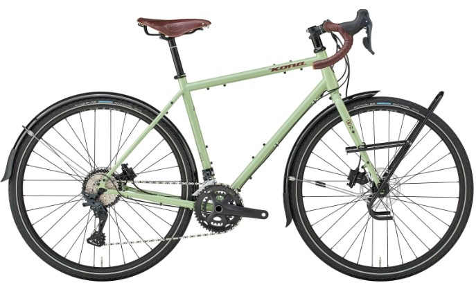 | Product | Frame Material Kona Cromoly Butted Sizes 48, 50, 52, 54, 56, 58 Rear Shock n/a Fork Kona Project Two Cromoly Disc Touring Crankarms Prowheel Chainrings 30/46t B/B Prowheel BB68+ Pedals n/a Chain KMC X10 Cassette Microshift Sword 11-38t 10spd Chainguide n/a F/D Microshift Sword R/D Microshift Sword Shifters Microshift Sword Brake Calipers TRP HDC711C Mechanical / Hydraulic Front Brake Rotor TRP TR160mm Rear Brake Rotor TRP TR160mm Brake Levers Microshift Sword Headset FSA No.1/No.10 Handlebar Kona Road Stem Kona Road Seatpost Kona Deluxe Thumb w/Offset 27.2mm Seat Clamp Kona Clamp Grips Brooks Microfiber Brown Saddle Brooks B17 Leather Front Hub Formula 100x12mm Rear Hub Formula 142x12mm Spokes Stainless Black 14g Rims WTB ST i23 TCS 2.0 Front Tire Schwalbe Marathon Mondial 700x40c Rear Tire Schwalbe Marathon Mondial 700x40c Paint Color Gloss Jade w/ Leather Decals Extras Fenders w/ Mudflaps, Tubus Tara Big Apple Front Rack |