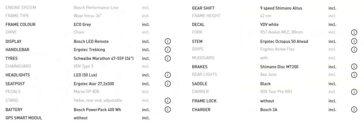 | Product | This bike has been ordered in this specification but if you would like to configure your own, please click the link below. Experience an unparalleled riding sensation like floating on air with our Comfort E-Bikes. These bikes are characterized by their low step-through frame and an exceptionally comfortable geometry. The low step-through design allows for effortless mounting, while the battery, neatly integrated into the frame, is easily removable. With the curved handlebars, the riding position is upright and supremely comfortable, and the adjustable stem allows for a personalized fit. Comfort Bikes are the perfect companions for short to medium rides and everyday use, especially if you prioritize comfort. Choose Comfort when... You want to effortlessly mount your bike and start your rides with ease. You're in search of an everyday companion for shopping trips or short excursions. You aim for the utmost comfort during your rides without compromising on convenience. Experience an unparalleled riding sensation and enjoy worry-free journeys with our Comfort E-Bikes. Configure your Comfort E-Bike now and discover how ease and comfort enhance your daily life. Click here for your custom eBike configurator - VeloDeVille Bikes |