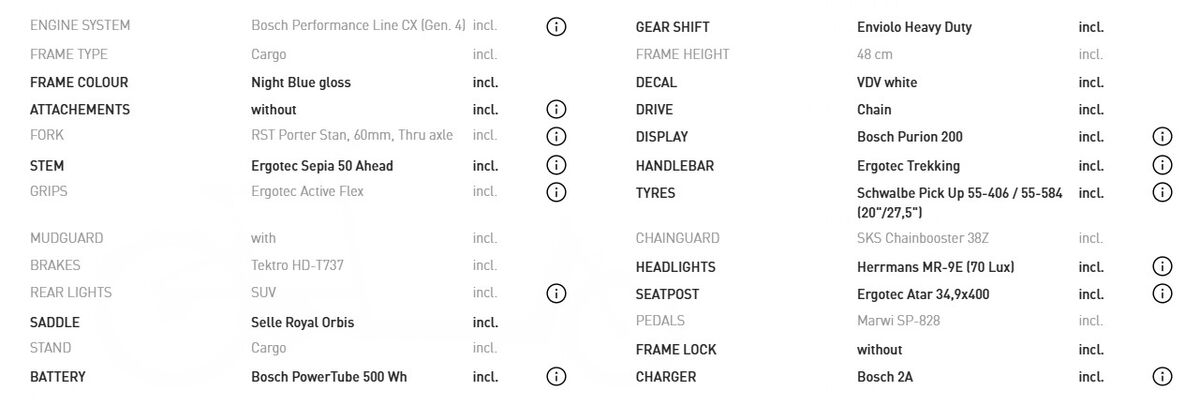 Upgrades | Some examples of upgrades : CARGOBOX +£519.00 TRANSPORT Rail set +£259.00 CARGOBOX EQUIPMENT All-weather-canopy +£259.00 Gear Shift Enviolo Heavy Duty AUTOMATIQ +£339.00 DRIVE Gates CDX Belt drive +£259.00 DISPLAY Bosch Kiox 300 +£89.00 DISPLAY Bosch Kiox 500 +£119.00 BATTERY Bosch PowerTube 625Wh +£169.00 BATTERY Bosch PowerTube 750Wh +£369.00 BATTERY Bosch PowerTube 1000Wh Duel Battery +£899.00 BATTERY Bosch PowerTube 1250Wh Duel Battery +£1239.00 BATTERY Bosch PowerTube 1500Wh Duel Battery +£1629.00 |