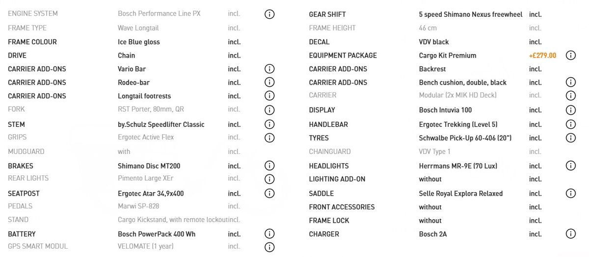 Upgrades | This upgrade included in the RRP: Cargo Kit Premium +£279.00 Some examples of upgrades : DISPLAY Bosch Kiox 300 +£69.00 DISPLAY Bosch Kiox 500 +£99.00 DISPLAY Bosch Purion 200 +£9.00 BATTERY Bosch Power Pack 545Wh +£259.00 BATTERY Bosch Power Pack 800Wh +£559.00 |