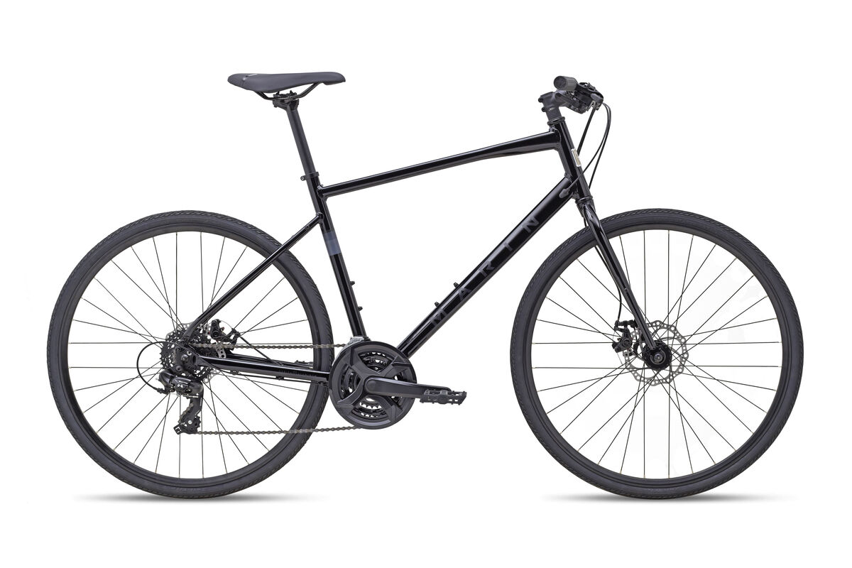 Product | The Fairfax line of bikes has the speed of a road bike with a more comfortable upright position for meeting your weekly riding goals. The Fairfax line of fitness bikes have the speed of a road bike with a more comfortable upright position for meeting your weekly riding goals. Built with weekend bike path and weekday fitnessriders in mind, the Fairfax bikes are equally at home on shorter after work rides or longer weekend adventures. Disc brakes provide sure stopping power in all conditions, and all frames feature rack and fender mounts for commuter use. Frame: Series 1 Fitness, 6061 Aluminum, 700C Wheels, Disc Brake, Internal Cable Routing, Fender, Rack and Kickstand Mounts Fork: Cr-Mo Steel, Straight Blade, Disc Mount, QR Dropouts, Fender and Rack Eyelets Headset: FSA, Threadless Stem: Marin Alloy Threadless Handlebar: Marin Alloy Flat, 31.8mm Grips: Marin Commute Brake Levers: Shimano w/ Integrated Shifters Brakes Front: Clark's CMD-23 Mechanical Disc, Shimano Pad Compatible, 160mm Rotor Brakes Rear: Clark's CMD-23 Mechanical Disc, Shimano Pad Compatible, 160mm Rotor Tires: Fitness 700Cx35mm Rim: Marin Aluminum Double Wall, Disc Specific Hub Front: Forged Aluminum Alloy, Disc, 32H Hub Rear: Forged Aluminum Alloy, Disc, 32H Spokes: 14g Stainless Steel Derailleur Front: Shimano TY510 Derailleur Rear: Shimano Tourney, 7-Speed Shift Lever: Shimano Shifter/Brake Lever Combo, 3x7-Speed Chain: KMC Z8 Cassette: Shimano CSHG200, 7-Speed, 12-32T Crankset: Alloy Crank, Steel Chainrings, 48/38/28T, Ring Guard Bottom Bracket: Sealed Cartridge Bearings, Square Taper Pedals: Nylon Platform Saddle: Marin Fitness Plush Seatpost: Marin Alloy, 27.2mm |