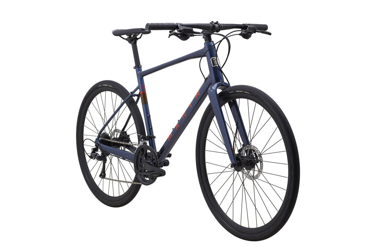 Product | The Fairfax line of bikes has the speed of a road bike with a more comfortable upright position for meeting your weekly riding goals. The Fairfax line of fitness bikes have the speed of a road bike with a more comfortable upright position for meeting your weekly riding goals. Built with weekend bike path and weekday fitnessriders in mind, the Fairfax bikes are equally at home on shorter after work rides or longer weekend adventures. Disc brakes provide sure stopping power in all conditions, and all frames feature rack and fender mounts for commuter use. Frame: Series 3 Fitness, 6061 Aluminum, 700C Wheels, Relieved Tapered Head Tube and BB, Internal Cable Routing, Disc Specific Forged QR Dropouts, Rear Kickstand Mount, Fender and Rack Mounts Fork: Marin Full Carbon w/ Tapered Steerer, QR Dropout, Fender Eyelets Headset: FSA, No.42/CB Stem: Marin 3D Forged Alloy Handlebar: Marin Alloy Flat, 31.8mm Grips: Marin Ergonomic Locking Brake Levers: Clark's Hydraulic Brakes Front: Clark's Clout Hydraulic Disc, 160mm Rotor Brakes Rear: Clark's Clout Hydraulic Disc, 160mm Rotor Tires: Vee Tire, G-Sport, 700Cx35mm, Puncture Protection, Wire Bead Rim: Marin Aluminum Double Wall, 19mm ID, 25mm Tall, Disc Specific Hub Front: Forged Aluminum Alloy, Disc, 32H Hub Rear: Forged Aluminum Alloy, Disc, 32H Spokes: 14g Black Stainless Steel Derailleur Front: microSHIFT R9 Derailleur Rear: Shimano Sora Shift Lever: microSHIFT R9 2x9 Flat Bar Road Shifters Chain: KMC X9 Cassette: Shimano, 9-Speed, 11-34T Crankset: Forged Alloy, 48/32T Chainrings, Ring Guard Bottom Bracket: Sealed Cartridge Bearings, Square Taper Pedals: Nylon Platform Saddle: Marin Fitness Plush Seatpost: Marin Alloy, 27.2mm |